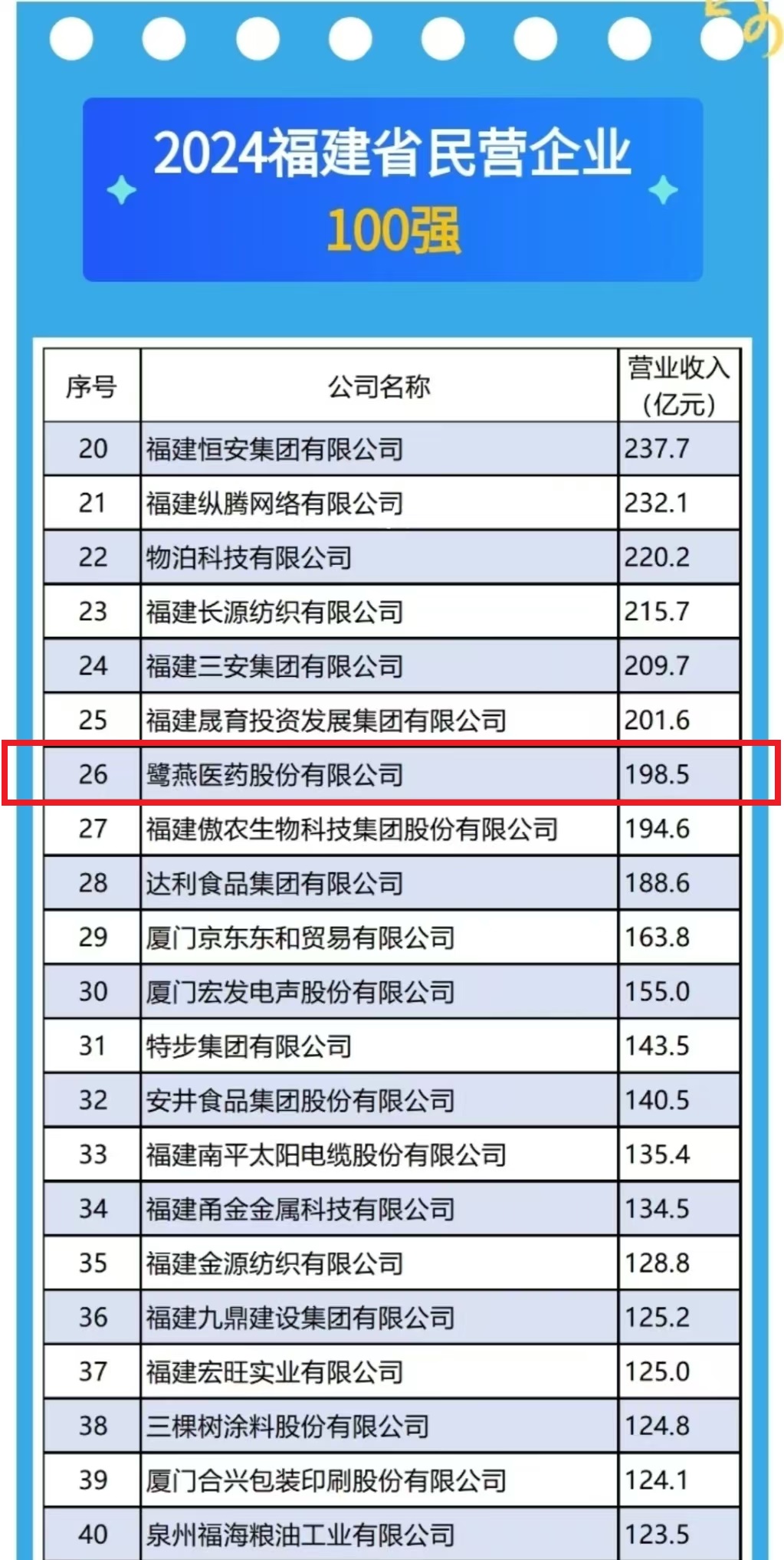 本月,福建省工商聯(lián)發(fā)布2024福建省民營(yíng)企業(yè)100強(qiáng)、制造業(yè)民營(yíng)企業(yè)100強(qiáng)、服務(wù)業(yè)民營(yíng)企業(yè)100強(qiáng)、創(chuàng)新型民營(yíng)企業(yè)100強(qiáng)和民營(yíng)企業(yè)社會(huì)責(zé)任100佳5個(gè)榜單。鷺燕醫(yī)藥榮獲2024福建省民營(yíng)企業(yè)100強(qiáng)第26位、福建省服務(wù)業(yè)民營(yíng)企業(yè)100強(qiáng)第10位、福建民營(yíng)企業(yè)社會(huì)責(zé)任100佳!