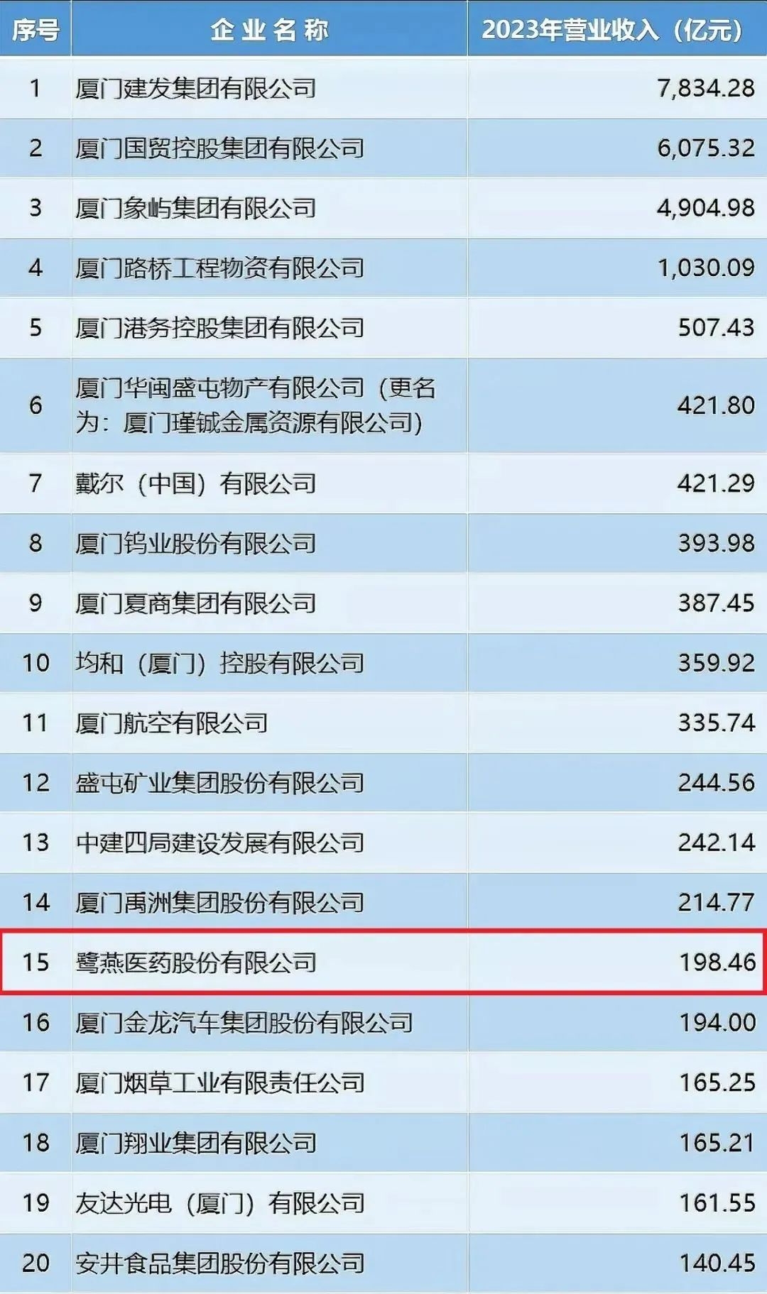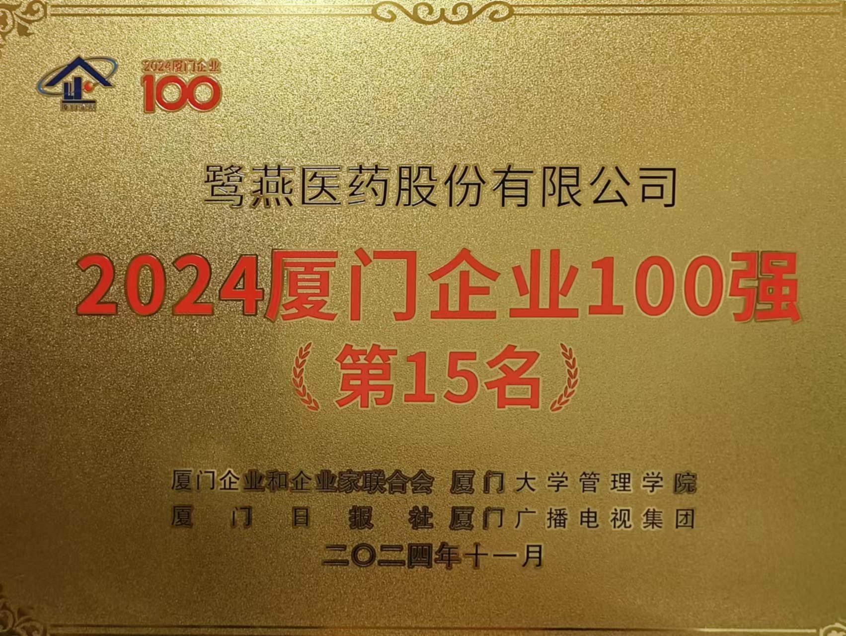 2024年11月,廈門企業(yè)和企業(yè)家聯(lián)合會發(fā)布2024廈門企業(yè)百強(qiáng)榜單,鷺燕醫(yī)藥股份有限公司榮列第15位!